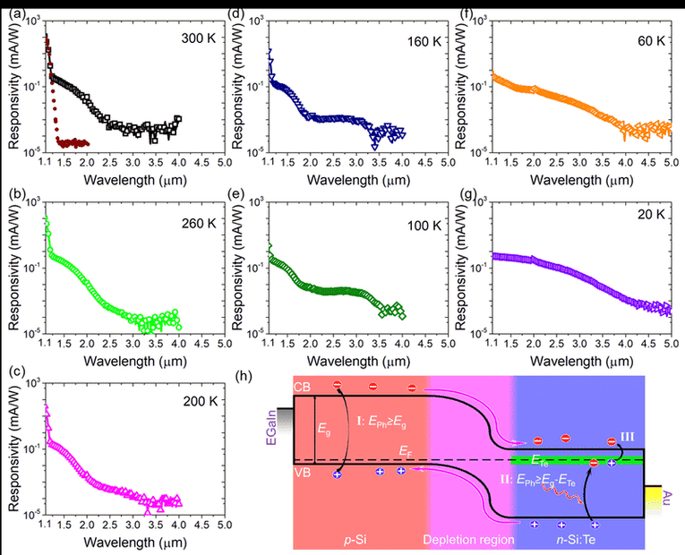 “(a)-(g) The spectral responsivity measured at zero bias (i.e. photovoltaic mode) for the Te-hyperdoped Si photodetector at different temperatures. The room-temperature spectral responsivity of a commercial Si-PIN photodiode (model: BPW34) is included as a reference (brown short dot). (h) Illustration of the below-bandgap photoresponse in the Te-hyperdoped Si photodetector. Te dopants introduce deep-level states (intermediate band) inside the Si band gap, which facilitate the absorption of photons with sub-bandgap energies. Process I: VB to CB (Eph ≥ Eg); Process II: VB to IB (Eph ≥ Eg-ETe); Process III: IB to CB (Eph ≥ ETe, only measurable at low temperatures where the thermal contribution is neglected).”