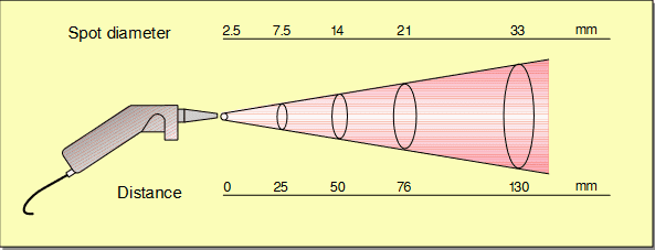 Simple infrared non-contact thermometers are generally total radiation pyrometers. The optical system of such infrared thermometer determines a circular measurement spot and the target must completely fill out this spot. Thus, the radius of the measured spot on the target has to scale with the distance. See, for example, Fig. 11 and 12 in [PDF]Principles of Non-Contact Temperature Measurement.