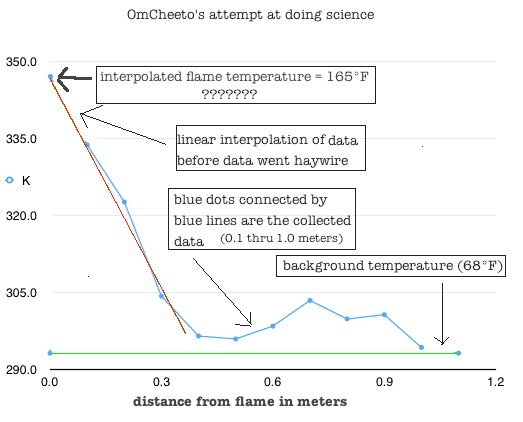 ps. This gives me a grand idea for a new experiment. I've had an infrared thermometer for several years, and it works great for measuring the temperature of big things, like my wood stove, the side of my house, etc. But it's pretty much useless for measuring small or odd shaped things, like candle flames or electric stove top heating elements. Although those two examples are thermally outside the range of my device, I'm wondering if I could use the 1/r2 law, and some maths, to semi-accurately measure their temperatures.