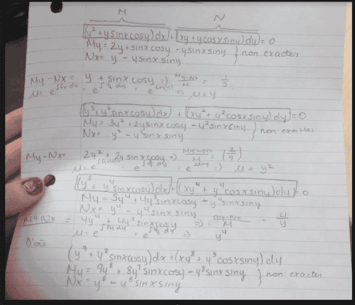 The problem involves solving a differential equation of the form (y^2 + y sin x cos y) dx + (xy + y cos x sin y) dy = 0, with the initial condition y(0) = π/2. Participants are exploring the exactness of the equation and the implications of dividing by y.