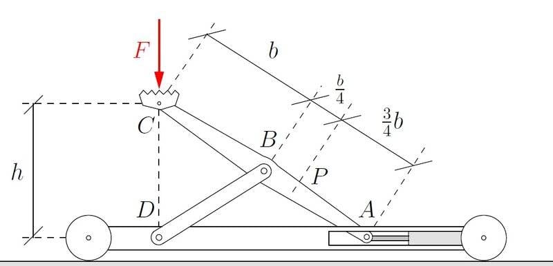 1. Calculate the force acting on the hydraulic cylinder using the principle of virtual work. To do this, first design a simple beam model of the jack and insert suitable supports at points A and D.