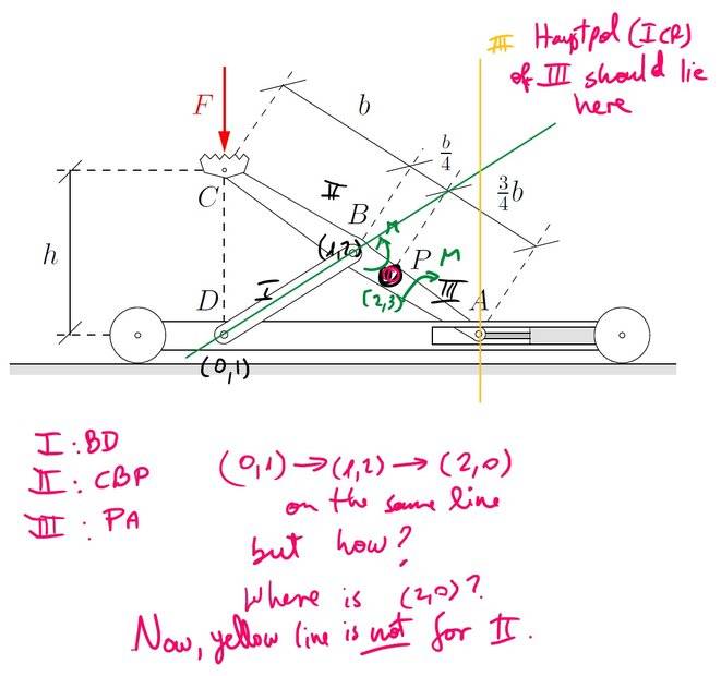 I did part 1 of this HW using the rules for findint Instantaneous Center of Rotations in STATICS (Hauptpol in german) and Nebenpol (idk how to translate it). I attached my calculation and it's supposed to be the right answer. I replaced the two forces on A (piston force Ah and vertical reaction Av) by a single valued suppor (with Av) and a force Ah which I treat as not being part of the support, leaving the support free to slide. This is the method I was taught. Then I apply rules to find the ICR (Hauptpole): for example, assuming that point B is a Nebenpol (1,2) then (0,1) - (1,2) and (2,0) should lie on the same line, but on the other hand, the perpendicular support at A means that the (2,0) Hauptpol should lie on the line perpendicular to the movement of that support (vertical line then) and (0,2) is found. The rest is geometry to make small displacements.