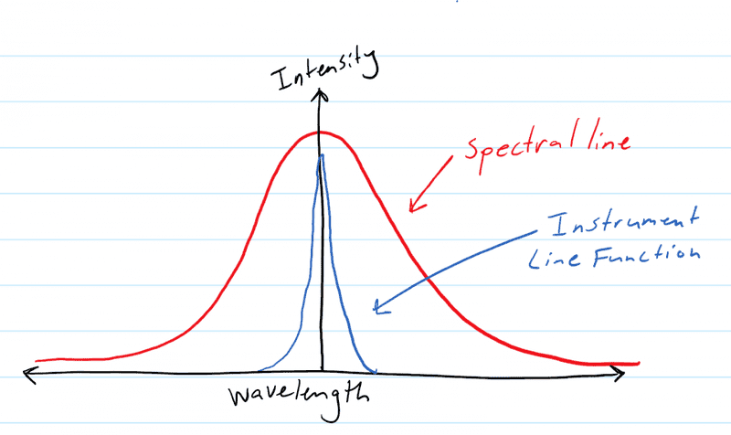 The discussion revolves around the concept of the instrument line function in spectrometers, exploring how it is produced and its implications for spectral measurements. Participants delve into the factors contributing to the instrument line function, including the effects of finite slit width and optical imperfections, as well as the convolution of the actual spectral line with the instrument response.