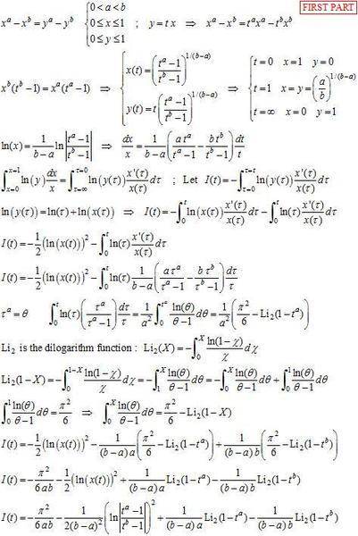 The trivial solution of y=x causes the integral to diverge. Frankly, I'm at a loss on how to approach this problem. Clearly you cannot solve for y in general as a and b can also take on non-integer values.