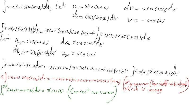 The integral of sin(x) sin(x+1) dx from 0 to 2π can be simplified using the trigonometric identity sin(A)sin(B) = 1/2 [cos(A-B) - cos(A+B)]. By applying this identity, the integral can be expressed as I = cos(1) ∫_0^(2π) sin²(x) dx. The integration by parts approach led to confusion due to the omission of the constant of integration, resulting in a tautology rather than a contradiction. This highlights the importance of careful handling of constants during integration.