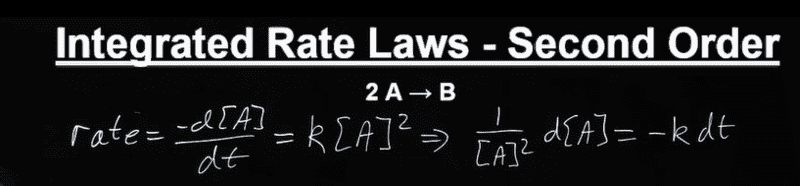 The integrated rate law for second-order reactions is defined without including stoichiometric coefficients in the rate expression. The rate of reaction is universally defined as (1/a)*d[A]/dt, where 'a' represents the stoichiometric coefficient. This approach ensures consistency across different reactants, regardless of their coefficients in the balanced equation. For example, the rate expressions differ for reactions such as A → ½B and 4A → 2B, emphasizing the importance of specifying the reagent in question.