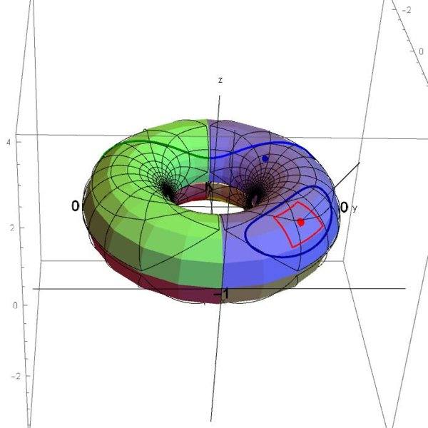 The torus is given by ##\{(R+\rho \cos(\alpha))\cos(\phi),(R+\rho \cos(\alpha))\sin(\phi), \rho \sin(\phi)\}## or ##(x^2+y^2+z^2+b^2-a^2)^2=4b^2(x^2+y^2)##. Let's just use R=2 and ##\rho=1## and let me pick a point on the torus with ##\alpha=\pi/3## and ##\rho=\pi/4##. I now want to draw a small closed circle-like contour around that point on the torus so I'll just use a torus section consisting of a plane slicing through the torus and normal to the surface at the point and a little below it. That plane is given by: $$ n_x(x-a x_1)+n_y(y-a y_1)n_z(z-a z_1)=0$$ with ##a## being a scale factor say ##a=0.9##. The plot below is what that looks like. So where the plane intersects the torus is my blue contour. So that I need $$\int_{\text{blue}} f(x,y,z) \sqrt{x'(t)^2+y'(t)^2+z'(t)^2}dt$$