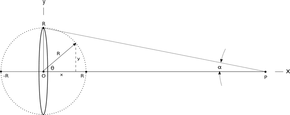 So, if I place a small point mass m at the origin of the xyz axis, and a disk whose center is distance x along the x-axis away from the origin, and the very thin disc is of weight "dM" the force of gravity of the disk is: