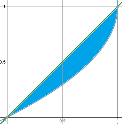 - There is a calculation of the limits of integration by equating the two curves, leading to the conclusion that \(x\) ranges from 0 to 1.