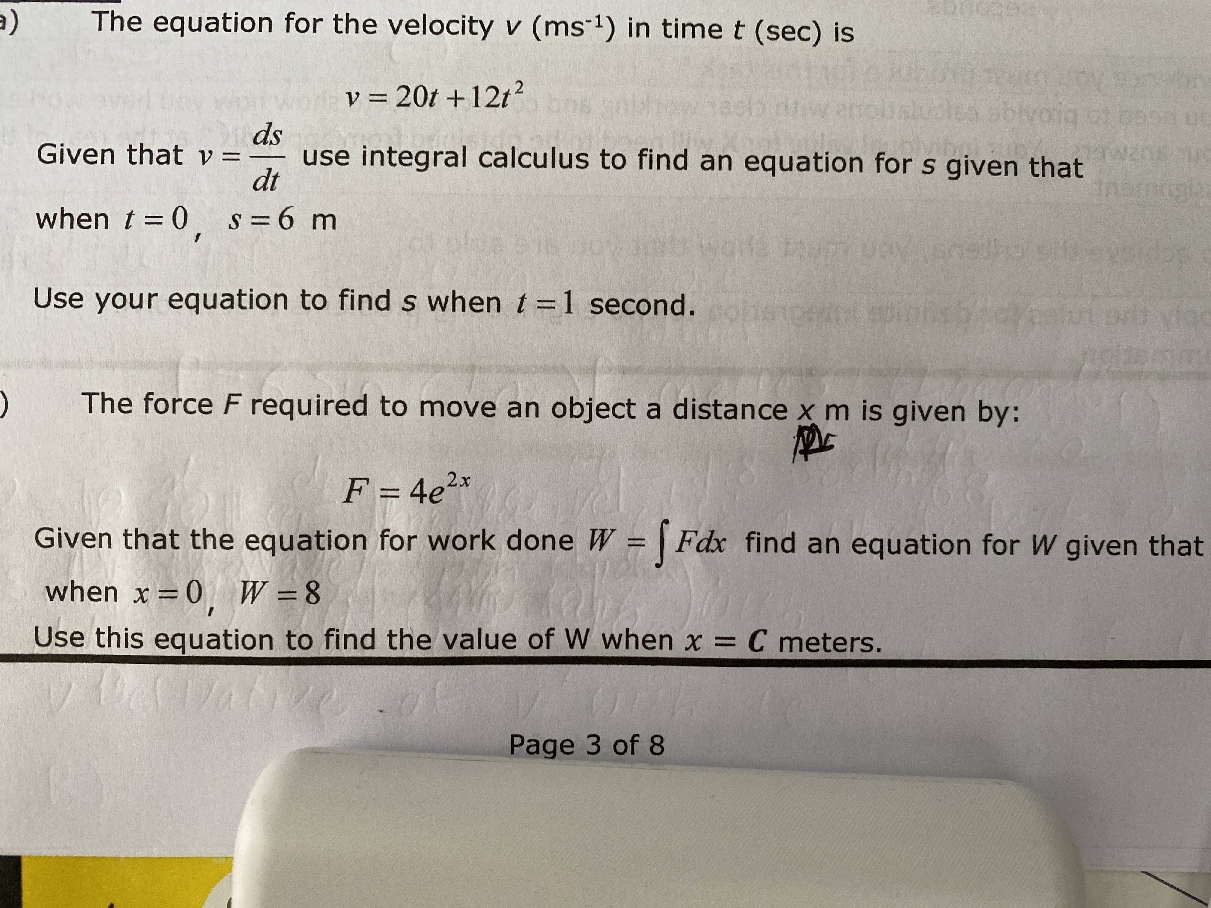 The discussion revolves around integration techniques, specifically related to calculating distance and work from given expressions. Participants are seeking clarification on how to approach these integration problems, including the necessity of boundary conditions.