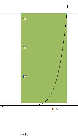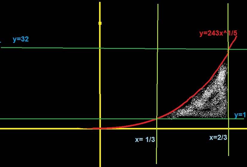 Find the area under curve $y=243x^5$ and between y=1 and y=32