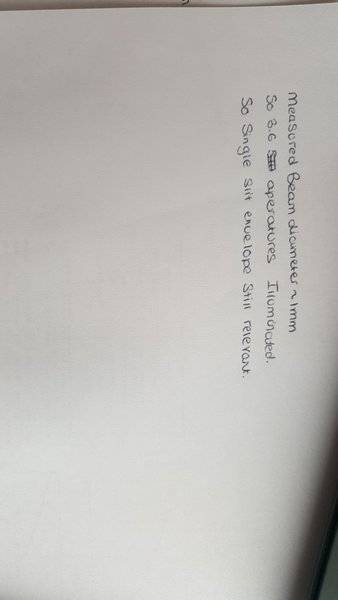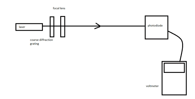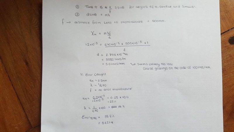 The experimental setup involved a helium neon laser of wavelength 670nm +- 1nm, pointed towards a lens with focal length 500mm +- 1mm. (so that the equations used corresponded to the far field diffraction pattern) and onto a photo diode so that for all intents and purposes the voltage is proportional to the Intensity.
