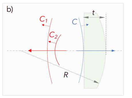 The first asks to write the curvature of the spherical waves, C1 and C2 after reflecting in the plane and spherical front respectively, as a function of R, radius of curvature of the lens, n index of refraction of the lens and t, the thickness of the lens.
