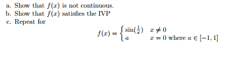There is a mention of the requirement for continuity in relation to the IVP, and participants are grappling with the implications of discontinuity in this context. The original poster expresses uncertainty about the continuity of the function, which is central to the discussion.