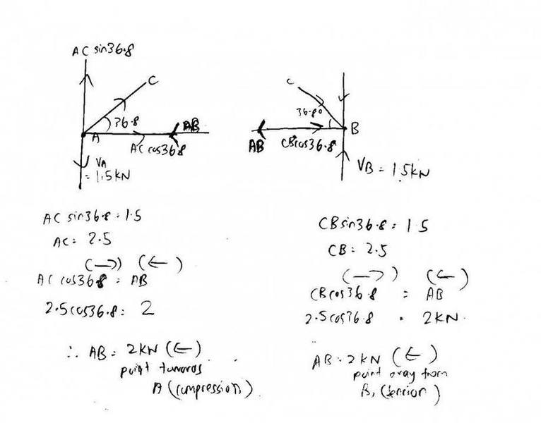 - One participant notes that the internal forces AB at points A and B point in the same direction, questioning how they can cancel each other out and suggesting that this indicates instability and statically indeterminate conditions.