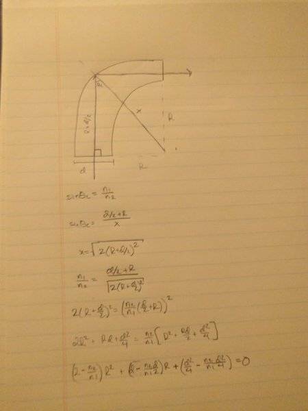 My work is in the thumbnail. I am not entirely sure how to approach this problem. My though process was to find the critical angle in which the light is internally reflected, and then use geometry to find the radius of curvature, since I am not sure of any more equations that would help me. I also though of using arc length in some way, to relate the distance the light traveled in the tube to the circumference of the circle.
