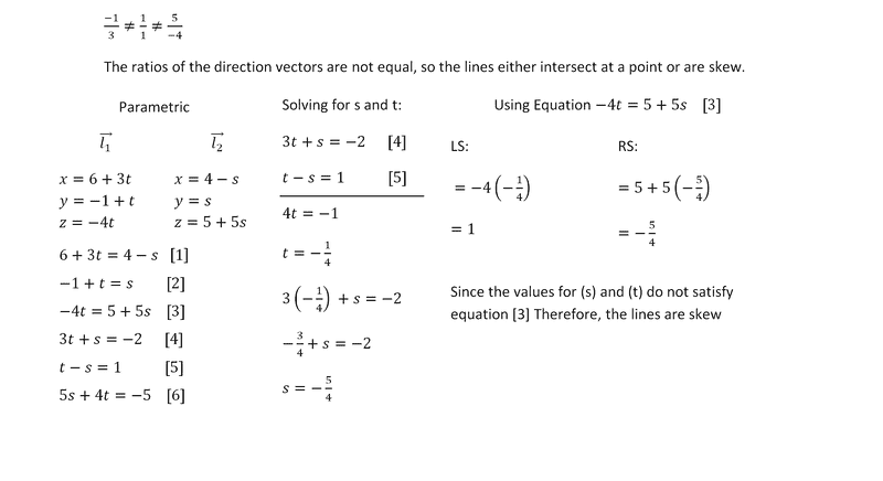 - Participants explore the concept of intersection for skew lines and question whether skew lines can intersect. There are attempts to verify calculations for specific values of parameters t and s, with some participants expressing uncertainty about the results.