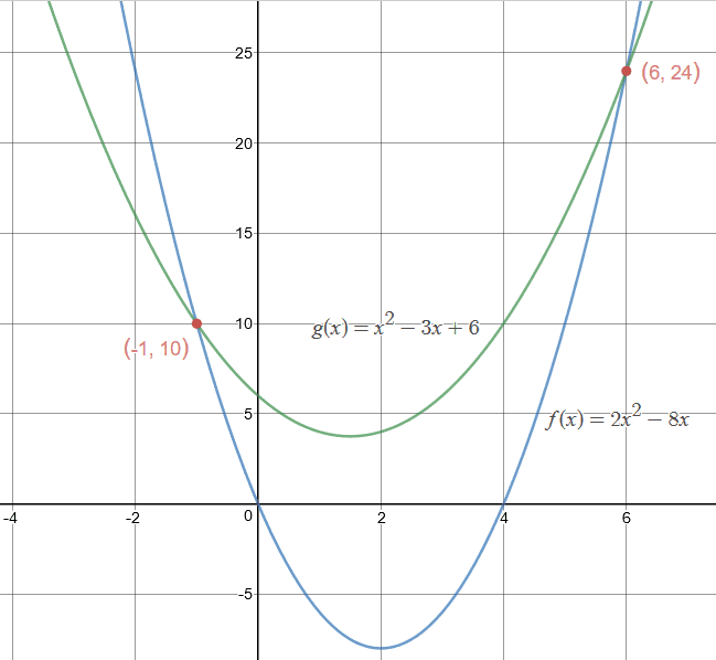 The intersection points of the quadratic functions \(f(x) = 2x^2 - 8x\) and \(g(x) = x^2 - 3x + 6\) are definitively located at the coordinates \((-1, 10)\) and \((6, 24)\). This conclusion is supported by graphical representation, tabular data, and algebraic verification. The algebraic method involves setting \(f(x)\) equal to \(g(x)\), leading to the equation \(x^2 - 5x - 6 = 0\), which factors to \((x + 1)(x - 6) = 0\). The values of \(x\) where the functions intersect are confirmed as \(-1\) and \(6\).