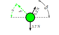 The 5.7 N weight is in equilibrium under the influence of the three forces acting on it. The F force acts from above on the left at an angle of α with the horizontal. The 5.2 N force acts from above on the right at an angle of 63◦ with the horizontal. The force 5.7 N acts straight down.