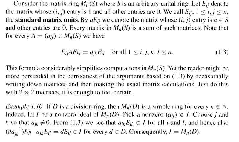 Question 2Bresar seems to be assuming that ##d E_{il} \in I ## for all ##1 \le i, l \le n## and for every ##d \in D## implies that ##I = M_n (D)## ...