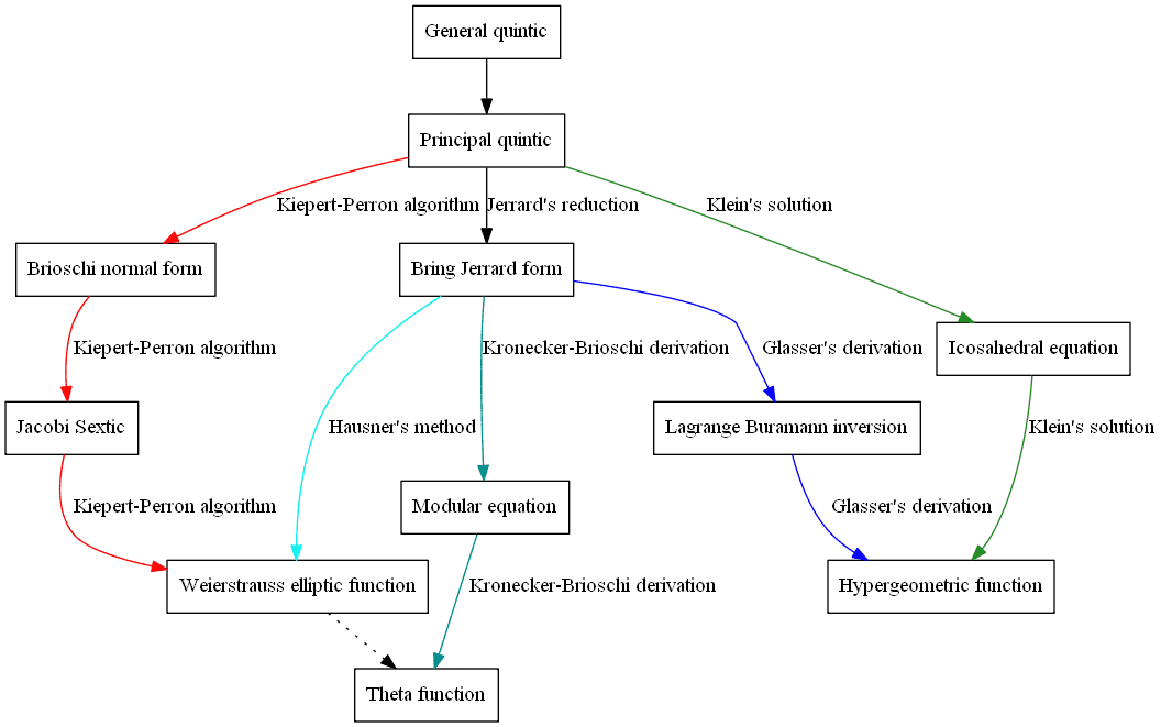 This is a graph containing the main Tschirnhausen transformations of a general quintic and the algorithms to solve them. The methods would be explicitly described most probably elsewhere in this forum