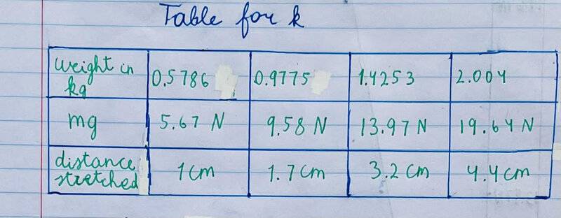 (a) find a value for k in Hooke’s Law F=kx experimentally by hanging several weights to it (but careful not to use weights which were too heavy) versus the length this stretches the rubber band (including the length of stretch that one will use to shoot) to shoot a projectile . From the straight-line graph (force versus stretch distance) one obtains the spring constant.