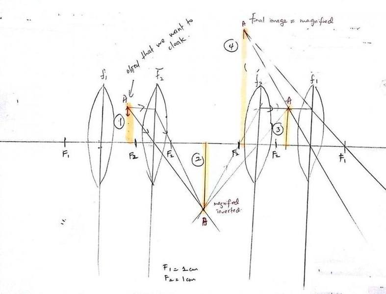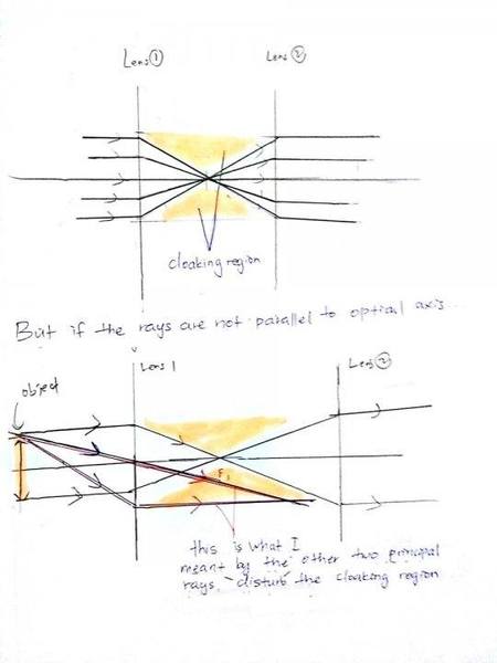 What I don't understand is how's the object between the lenses is cloaked. Is it because the rays are focused to a point after it passed through the first lens? (hence, there will be a region where rays do not pass through?) assuming that's the answer, but then in that case, isn't that, only rays that are parallel to the optical axis come into focus at one point? (which is the focal point) how about the rays that pass through optical center and the rays that pass through the first focal point and become parallel? if we draw a diagram, wouldn't these two principal rays disturb the cloaking region? i tried to draw a ray diagram to understand how this works. the final image of the object would be magnified and upright, but i still couldn't understand why can't we see the image, I really hope anyone here clear up my confusion because i have been thinking about this for days and my physics teacher couldn't help me that much. I have a very basic knowledge in optics such as constructing ray diagrams and solving problems using the thin lens equation. I'm sure there must be some concepts that i didn't know about. Here, I attach two diagrams i constructed to explain in a clearer way-hopefully- of what i don't understand. thank you in advance