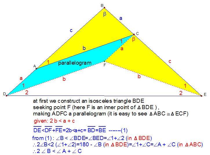 The discussion focuses on the geometric relationship within triangle ABC, specifically proving that if the inequality \(2b < a + c\) holds, then it follows that \(2\angle B < \angle A + \angle C\). This conclusion is derived using properties of triangles and angle relationships. The proof leverages the Law of Sines and the triangle inequality theorem to establish the necessary conditions for the angles based on the given side lengths.