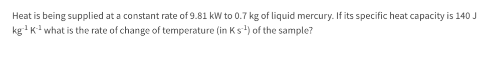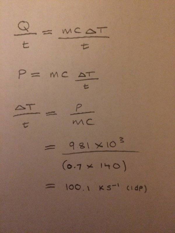 Participants note the significance of units such as kilowatts for power input and kilograms for mass, which are crucial for understanding the calculations involved. There is also mention of potential oversight in computations that could lead to the perceived high rate of temperature change.