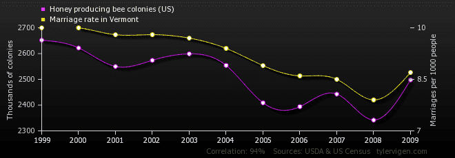 - There is a reference to a correlation between unrelated variables, such as honey bee colonies and marriage rates, to illustrate the potential pitfalls of interpreting high correlation values.