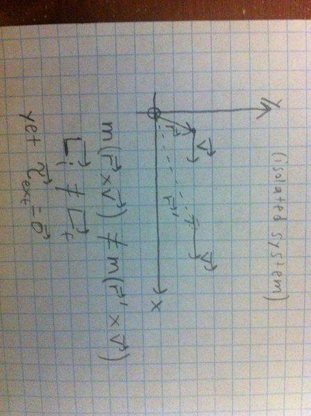 (This is a problem I myself created, so it may sound a bit trivial/stupid.) A particle of mass m in the xy plane has velocity v and a radius vector r with respect to some origin. After some time Δt, the same particle has velocity v and a radius vector r' with respect to the origin. Throughout the particle's motion, the (supposedly) isolated system consisting of this particle is not subject to any external force nor any external torque.