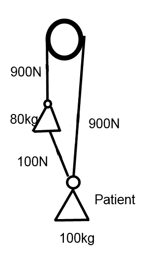 There is a patient on one end of a rope. This rope runs up and over a pulley and back down to the ground where a rescuer is located (next to the patient). The rescuer tethers themselves to the patient; this creates a loop from the patient up to the pulley, down to the rescuer, and over to the patient. The rescuer then climbs the rope. As they climb the loop gets smaller and pulls both the patient and the rescuer up. (For this analysis assume no friction, a massless rope, and everything is occurring in free space.)