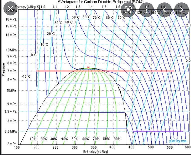 "If the hot side CO2 refrigerant of a heat pump is 2.5MPa from 125C to 0C, I thought the average temperature of the hot heat exchanger can be calculated by the log mean formula, and its phase stays a gas."