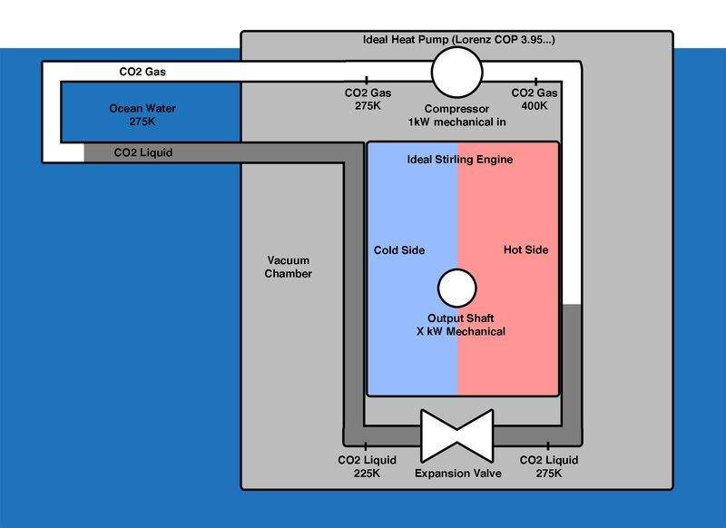 But the part I don’t understand is if we have phase changing in the heat exchangers, on the cold side where the C02 heats from a liquid to gas (absorbs heat from ocean water to 275k), the water is adding latent heat in addition to sensible heat. On the hot side, where the C02 changes phase from gas to liquid, it is discarding latent heat in addition to sensible heat.