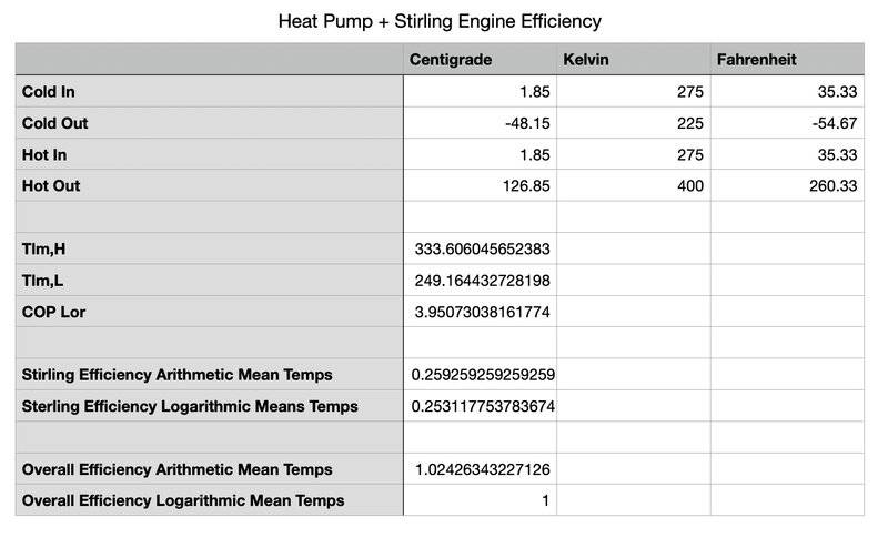 Additional potential problem: these are the temperatures of the heat pump working fluid, not the temperatures of the Sterling engine working fluid (though perhaps we can ignore that and assume it can be made equal with a 100% effective heat exchanger).