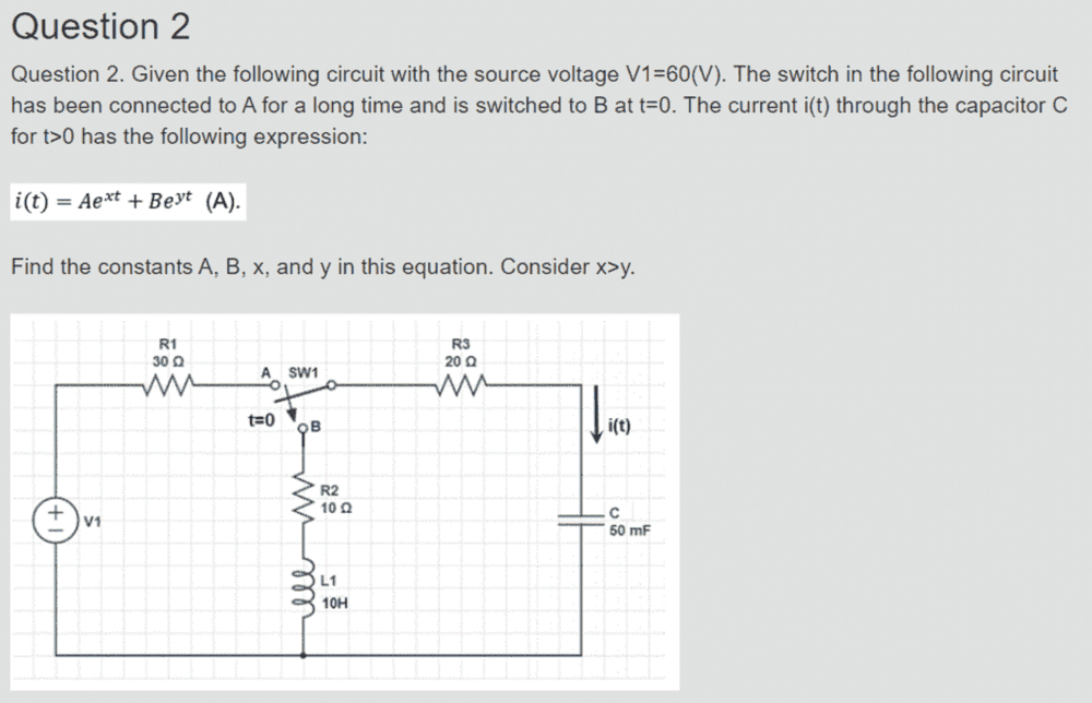 - Given the following circuit with the source voltage V1=60(V). The switch in the following circuit has been connected to A for a long time and is switched to B at t=0. The current i(t) through the capacitor C for t>0 has the following expression: