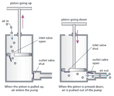 - A bicycle wheel pump works as shown in the figure below. When you pull up on the pump knob, the cylindrical barrel of the pump fills with air from the outside, which enters through a one-way valve. When the knob is pushed down, the air compresses into the tube until its pressure reaches that of the inner tube connected to the pump. At that point, another one-way valve allows air to go from the pump into the inner tube.