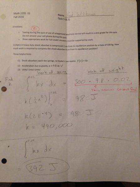 The discussion centers on the Work-Energy Principle, specifically addressing a student's misunderstanding regarding the relationship between work done by a spring and the work done by a weight. The professor's assertion that the work done must account for variable forces, as described by Hooke's Law, is confirmed. The student's calculation of the spring constant (k) was incorrect due to the assumption of a constant force, leading to an overestimation by a factor of two. Additionally, the student failed to show all steps in the integral calculation, which is essential for accurate problem-solving in physics.