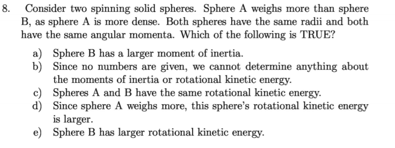 Participants note that both spheres have equal angular momentum, which complicates the relationship between their masses and rotational kinetic energies. The discussion highlights the need for clarity on the definitions of terms like "moment" and "inertia," as well as the formulas used in the context of rotational motion.