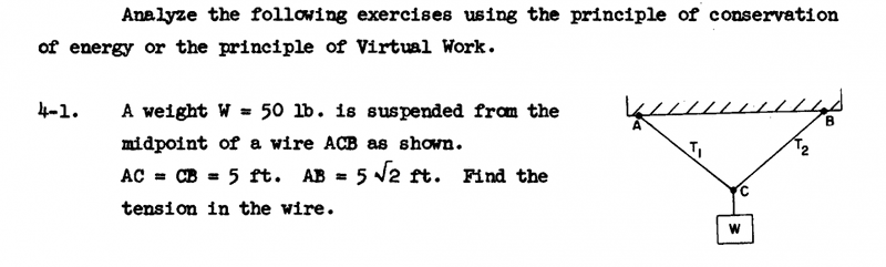 The discussion revolves around a weight tension problem involving the application of virtual work principles. Participants are exploring the validity of various reasoning approaches to determine the tension in a system of wires supporting a weight.