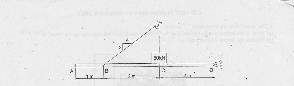 In the structure shown, a cable is attached to the 50 kN weight and to the beam A-D at point B. If the horizontal uniform beam weighs 8 kN/m, determine the following: