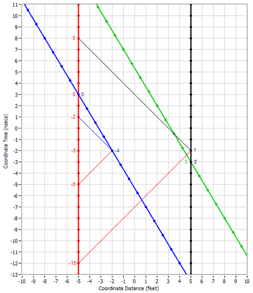 Now he's got a list of simultaneous events according to his established rest frame in the last two columns. For example, the event of his own clock displaying -8.75 is simultaneous with the event of Blue's clock displaying -7. And if you look at the above diagram, you can see that they both have the Coordinate Time of -5.75 nsecs in the train's rest frame. But note that the Red observer has no awareness of the Coordinate Time, he is basing this on his own Proper Time.