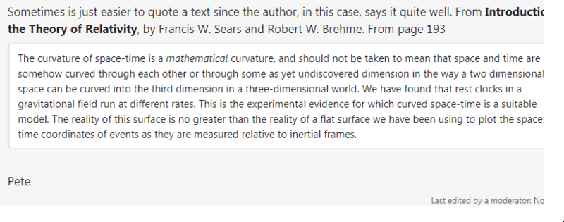 So does that mean if we were able to move to some spot "way above the earth/sun/distant galaxy" where we could watch light and trace it from a distant galaxy (which is otherwise hidden from us) pass around (?) the sun and hit our telescope, it wouldn't literally curve around the sun as is depicted in so many laymen's physics books? (I'm describing the Eddington experiment of course.)The curvature of space-time is a mathematical curvature, and should not be taken to mean that space and time are somehow curved through each other or through some as yet undiscovered dimension in the way a two dimensional space can be curved into the third dimension in a three-dimensional world.