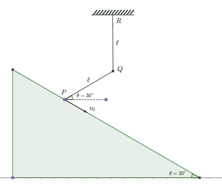 - As shown in the figure, two rods PQ and QR, pinned at Q and rod QR is hinged at R. P moves with a velocity v0 and acceleration a0 along the incline. We are required to find the angular velocities of P and Q, angular acceleration of PQ as well as QR.