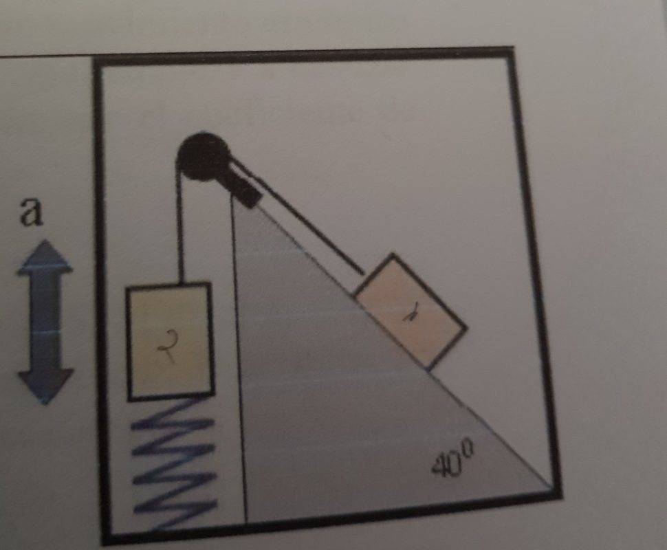 - Two bodies of equal mass are connected by an ideal rope and are inside a room which can accelerate vertically. The second body is attached to a spring of constant ##200 \frac{N}{m}##. Find the deformation of the spring when