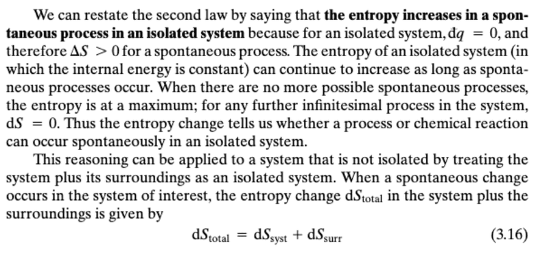 We can restate the second law by saying that the entropy increases in a spontaneous process in an isolated system because for an isolated system, ##\delta q=0## and therefore ##\Delta S>0## for a spontaneous process. The entropy of an isolated system (in which the internal energy is constant) can continue to increase as long as spontaneous processes occur.