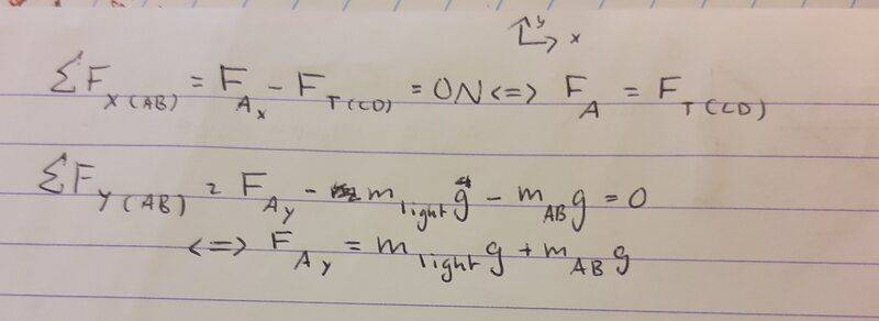 I thought that the force by the pivot A on the pole AB would be the reaction force to the x-component of the gravitational force on AB. This would mean that the force by the pivot would be parallel to the pole, but in my notes from class the force vector seems to be more along the bisector of CÂB..