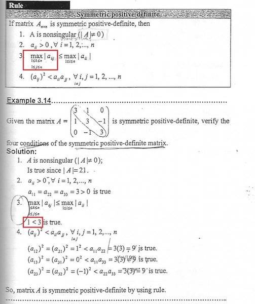 the book stated that for the positive symmetric matrix , we need to ensure that max a_kj less than max a_ii ,