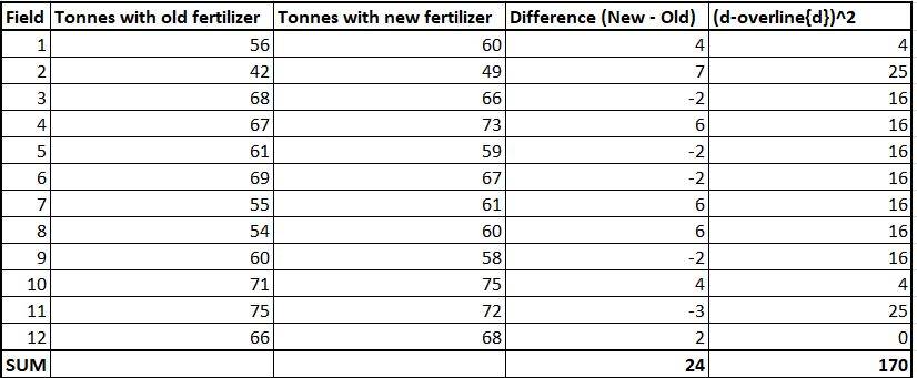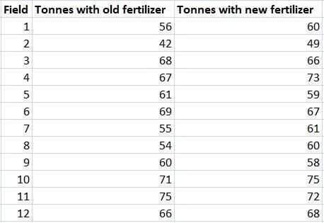 In an effort to evaluate the quality of a new fertilizer we selected 12 fields which we split exactly in the middle. In the one half we used the old fertilizer and in the other half we used the new fertilizer. Then we measured in tonnes the crop that was harvested from each piece of land.