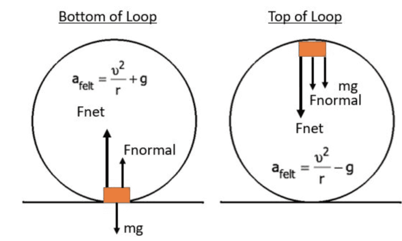 Coincidence that they are depicted nearly equal, but the gravity vector is a function only of mass (and distance from Earth if it's a really tall loop), whereas the normal force is a function of mass, loop radius, and the speed at which the loop is taken.mancity said:why is the normal force at the top of a rollercoaster loop the same direction as the force of gravity?